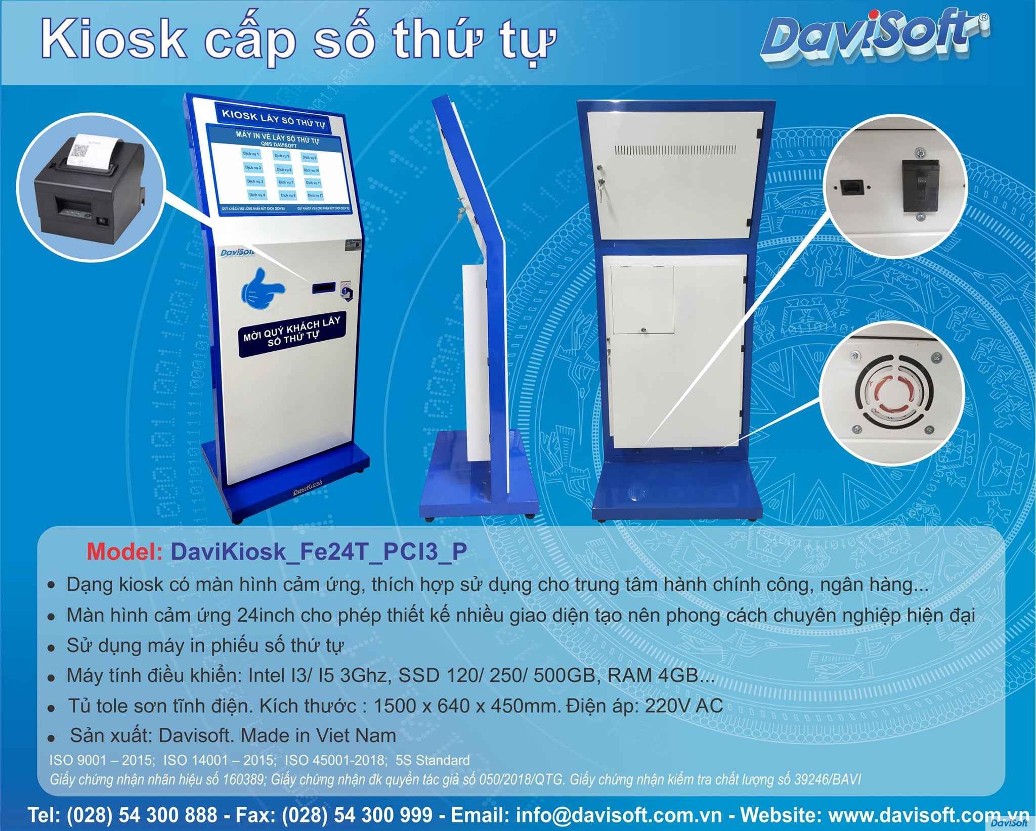 | Khung sườn chất liệu: Thép sơn tĩnh điện, chống gỉ, chống ăn mòn tốt, tạo hình và chế tạo bằng công nghệ Lazer CNC, kiểu dáng sang trọng bền bỉ, đặt biệt Kiosk chia thành 3 lớp độc lập để sơn tỉnh điện như sau: Lớp nắp mặt trước sơn tỉnh điện màu trắng, lớp thân khung sơn tỉnh điện màu xanh dương và lớp nắp mặt sau gồm có: nắp bảo vệ màn hình có khóa và bản lề nhựa 02 cái; nắp bảo vệ máy in + máy quét và bộ CPU có ổ khóa và bản lề 03 cái để đảm bảo không xệ nắp và sau tủ có nắp bật mở ngay máy in thuận lợi cho việc thay giấy in mà không cần phải mở ổ khóa nắp. | ||||